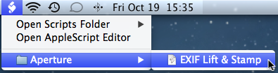 That's it - 3 steps. You can check your setup by clicking the AppleScript icon in the menu bar. You should see an Aperture folder with EXIF Lift & Stamp in it like this: