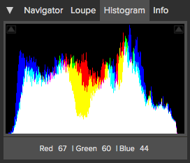 Perfect Effects presents both the luminance and RGB values in the histogram. White is overall luminance and the colors are the RGB values — the red, green and blue channels. Other colors that are displayed, such as yellow, cyan and magenta, are where the primary colors mix. There’s no “correct” or “perfect” histogram shape… it’s all relative to the mix of tones in your scene.