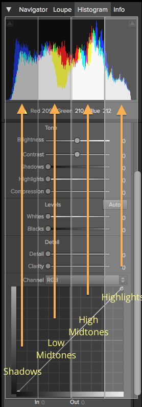 When I am working with the tone curve, I like to relate the curve to the histogram. Shadows on the left, highlights on the right, and everything else in between. When I read the tone curve, I mentally divide it into 4 columns — from left to right there’s the shadows, the low-midtones, the high-midtones, and the highlights. You might like 5 regions. Or 3. It really doesn't matter. It's still shadows on the left and highlights on the right.