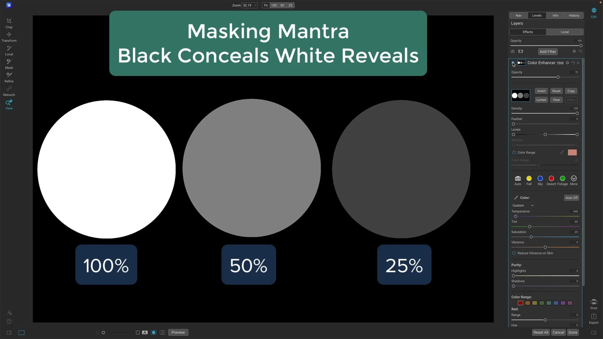 The mask for the Color Enhancer filter shows varying strength of the brush strokes. White areas of the (100%) mask reveal the full impact of the fitter. Gray areas (50%, 25%) allow for partial impact. Black areas (0%, the outer boundary) completely obscure the filter’s effect.