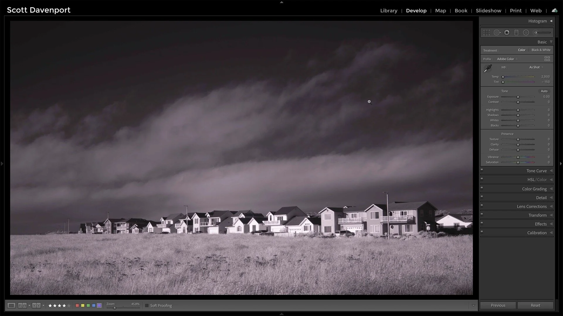 This is an unprocessed infrared image from my Sony A7R. Even with a “Deep B&W” conversion, there is a slight reddish-purple color cast. Also, notice the Temperature and Tint sliders are pegged to the left. Adjusting white balance is simply not possible.