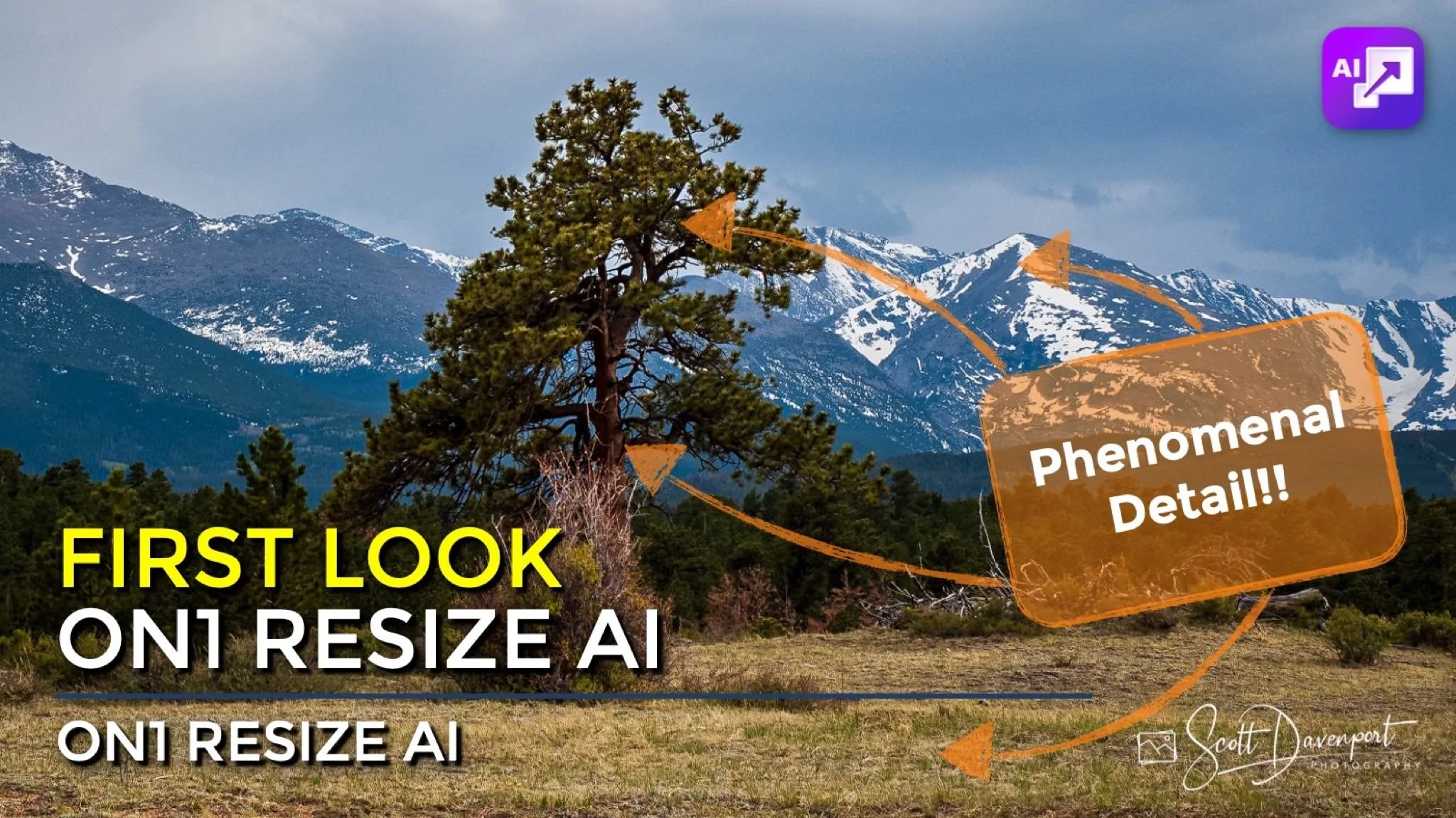 Want more amazing? Resize AI can actually add details as it enlarges the photo, because the AI has deep knowledge of the different surfaces. You’ll see this in action in the video accompanying this article. In the screenshot below, the photo is enlarged by ~40% or so. The snow-capped mountains in the background got more detail. The grasses in the foreground got more detail. The tree bark and pine needles got more detail. The sky remained soft. Everything looks natural and balanced. And this was a one-click task. In a word - impressive!